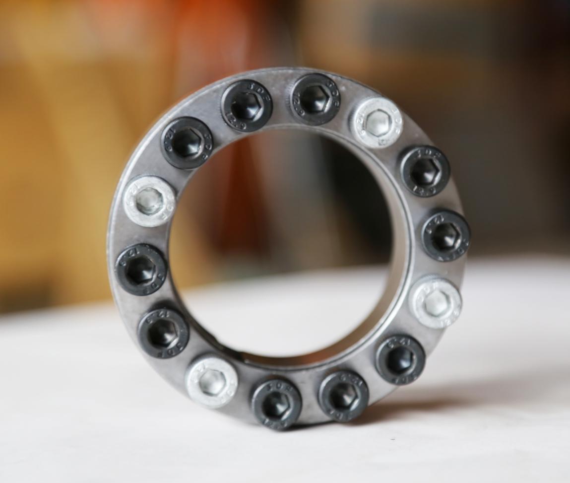 3. 取下頂出的鍍鋅螺釘,將頂出螺釘旋入前壓環(huán)的輔助螺孔中,輕輕敲擊被脹緊的傳動(dòng)件, 使其脹環(huán)松動(dòng),即可將脹套拉出